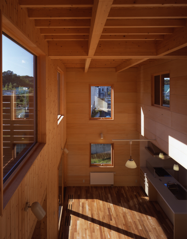 敷地の西側に川が流れ、眺望も日当たりも恵まれている川側に、地下室・吹きぬけのあるLDK・ウッドデッキを設けています。元気な3人の子供達がのびのびと成長できる北方型住宅です。